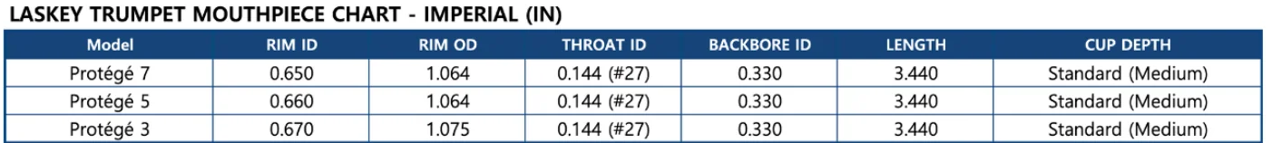Laskey Protégé Trumpet Mouthpieces were developed to meet the needs of beginning and emerging trumpet players, providing a comfortable and stable foundation on which to perfect their embouchure. A truly versatile mouthpiece for developing artists, the cup-to-throat ratio of this mouthpiece supports consistent air flow and balanced flexibility throughout the instrument's ranges, no matter what the part calls for.