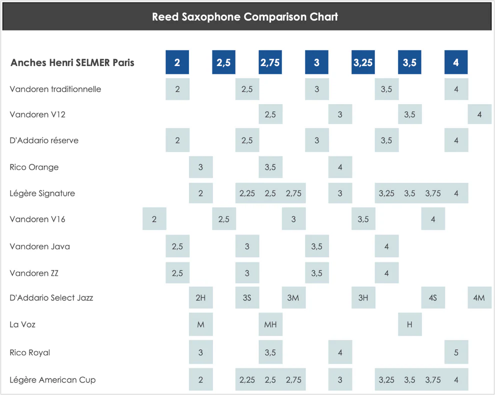 These reeds are available in strengths 2 to 4, and are calibrated by ¼ strength between 2.5 and 3.5 to reduce dispersion and so offer musicians a greater number of good reeds in the same box.