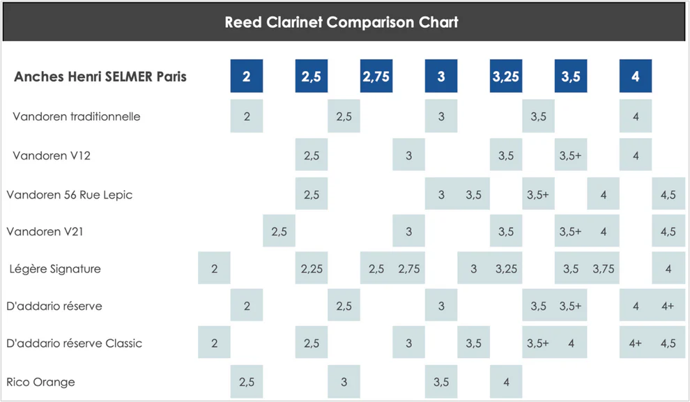 These reeds are available in strengths 2 to 4, and are calibrated by ¼ strength between 2.5 and 3.5 to reduce dispersion and so offer musicians a greater number of good reeds in the same box.